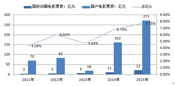 2011~2015年間,國(guó)產(chǎn)電影的國(guó)內(nèi)票房總額增長(zhǎng)了約4倍。其中,國(guó)產(chǎn)動(dòng)畫(huà)電影票房由2011年的3億元增長(zhǎng)到了2015年的21億元,增長(zhǎng)7倍,遠(yuǎn)快于國(guó)產(chǎn)電影票房整體。目前,國(guó)產(chǎn)動(dòng)畫(huà)電影已經(jīng)越來(lái)越受到觀眾們的重視與歡迎,國(guó)產(chǎn)動(dòng)畫(huà)電影占國(guó)產(chǎn)電影比重越來(lái)越高,由2011年的4.29%增長(zhǎng)到2015年的7.75%。