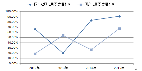 2012-2015年中國(guó)國(guó)產(chǎn)電影及國(guó)產(chǎn)動(dòng)漫電影票房增長(zhǎng)率