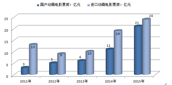 2011-2015年國(guó)產(chǎn)動(dòng)畫(huà)及進(jìn)口動(dòng)畫(huà)電影票房對(duì)比