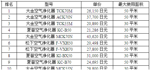 日本空氣凈化器銷量TOP10