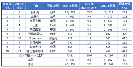 2014扌全球晶圓代工企業營收排行榜TOP10(百萬美元)
