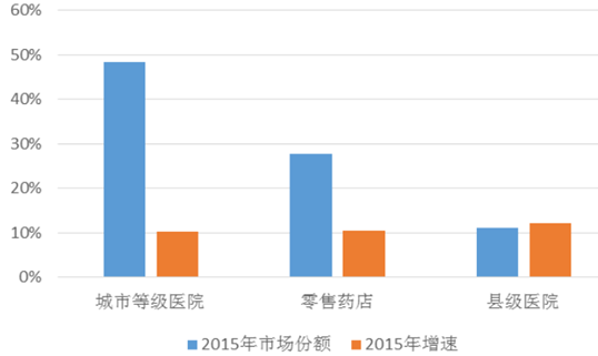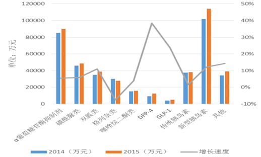 2015 年我國(guó)口服降糖藥終端分布和增速圖