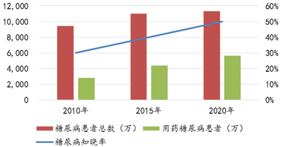 我國(guó)糖尿病患者知曉率和用藥人數(shù)圖