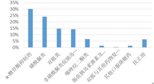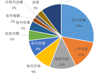 阿卡波糖等九個(gè)產(chǎn)品為化學(xué)藥,占市場(chǎng)份額的 87%。口服降糖藥中, 市場(chǎng)份額最大的是α糖苷酶抑制劑類藥物,代表為阿卡波糖和伏格列波 糖。樣本醫(yī)院阿卡波糖銷售額達(dá) 7.7 億元,為糖尿病用藥首位,其中拜 耳醫(yī)藥的拜糖平占 74%的份額。樣本醫(yī)院伏格列波糖銷售額為 1.2 億元, 同比增長(zhǎng) 19%,其中武田的倍欣占 55%的份額。雙胍類的藥品主要為二甲雙胍,銷售額增速為 11%,樣本醫(yī)院銷售額 為 3.9 億元,其中施貴寶藥業(yè)的格華止占 84%的份額。