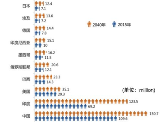 2015 年世界糖尿病患者(20-79 歲)數(shù)量前十的國(guó)家及 2040 年預(yù)估患者數(shù)量圖