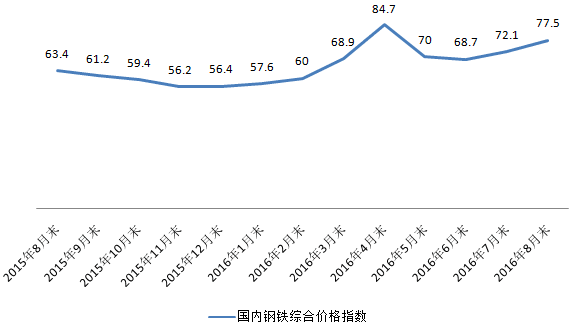 表4 2015年8月-2016年8月鋼鐵價格指數(shù)情況時間國內(nèi)鋼材綜合價格指數(shù)長材價格指數(shù)板材價格指數(shù)2015年8月末63.465.461.82015年9月末61.262.660.32015年10月末59.461.258.22015年11月末56.257.8552015年12月末56.456.956.82016年1月末57.657.858.52016年2月末6060.261.42016年3月末68.968.371.32016年4月末84.78686.52016年5月末7068.273.52016年6月末68.767.871.62016年7月末72.171.674.62016年8月末77.576.979.9圖9 2015年8月-2016年8月鋼鐵價格指數(shù)走勢