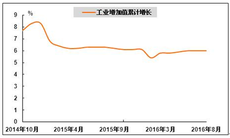 圖5 2014年10月-2016年8月規(guī)模以上工業(yè)增加值累計同比增速走勢