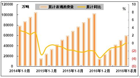 圖8 2014年10月-2016年8月鋼材表觀消費量累計同比變動趨勢