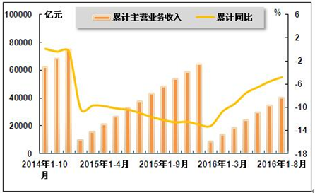 2016年8月,隨著國內(nèi)鋼鐵市場逐漸進入需求旺季,鋼鐵行業(yè)主營業(yè)務(wù)收入同比降幅已連續(xù)六個月收窄。國家統(tǒng)計局?jǐn)?shù)據(jù)顯示,2016年1-8月,鋼鐵行業(yè)累計實現(xiàn)主營業(yè)務(wù)收入40,264.3億元,同比下降4.8%,降幅比2016年1-7月和上年同期分別收窄0.7和6.9個百分點。