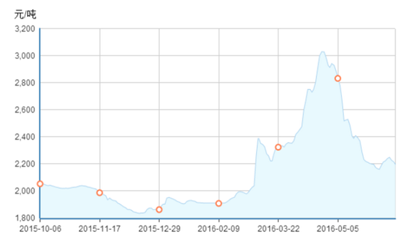 從上圖可以看出,國內鋼材價格自2015年12月初觸底后就開始緩慢回升,而2016年3-4月份出現了快速拉升的行情,隨后在4月下旬之后價格快速回落,在一個月的時間內價格跌去上漲幅度的60%多。