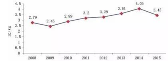 2015年,中國(guó)生鮮乳價(jià)格低迷,年初價(jià)格快速下跌, 年中價(jià)格低位徘徊,第四季度略有回升。據(jù)監(jiān)測(cè),10個(gè)主產(chǎn)省區(qū)(河北、山西、內(nèi)蒙古、遼寧、黑龍江、山東、河南、陜西、寧夏、新疆。)全年平均價(jià)格 3.45元/kg,同比下降14.8%。2008年以來(lái),生鮮乳價(jià)格年均漲幅3.1%,小于牛奶零售價(jià)格年均6.9%的漲幅(圖3)。
