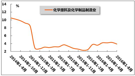圖3 2014年8月-2016年8月石油和化工行業(yè)增加值累計(jì)同比增速變動(dòng)趨勢(shì)