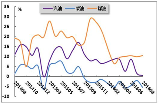 圖6 2015年8月-2016年8月我國(guó)成品油產(chǎn)量及同比增長(zhǎng)率