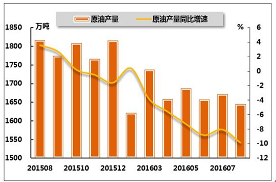 受低油價(jià)影響,我國(guó)原油產(chǎn)量持續(xù)負(fù)增長(zhǎng)。國(guó)家統(tǒng)計(jì)局?jǐn)?shù)據(jù)顯示,2016年8月份,我國(guó)原油產(chǎn)量1644.9萬(wàn)噸,同比下降9.9%,降幅較今年7月擴(kuò)大1.8個(gè)百分點(diǎn),而上年同期為同比增長(zhǎng)3.6%;原油加工量4427.6萬(wàn)噸,同比下降0.7%,而今年7月及上年同期分別為同比增長(zhǎng)2.5%、6.5%。從累計(jì)數(shù)據(jù)來(lái)看,2016年1-8月原油累計(jì)產(chǎn)量達(dá)13479.8萬(wàn)噸,同比下降5.7%,降幅較今年1-7月擴(kuò)大0.6個(gè)百分點(diǎn),而上年同期為累計(jì)同比增長(zhǎng)2.5%;1-8月,原油累計(jì)加工量為35613.5萬(wàn)噸,同比增長(zhǎng)2.1%,增速較今年1-7月回落0.4個(gè)百分點(diǎn),較上年同期回落2.8個(gè)百分點(diǎn)。