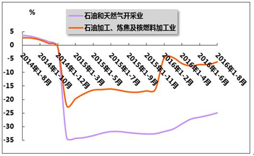 國(guó)家統(tǒng)計(jì)局?jǐn)?shù)據(jù)顯示,2016年1-8月,油氣開采業(yè)投資額1342.9億元,同比下降30.2%,降幅較今年1-7月擴(kuò)大2.1個(gè)百分點(diǎn),較上年同期擴(kuò)大29.1個(gè)百分點(diǎn);石油加工、煉焦及核燃料加工業(yè)投資額1736.1億元,同比增長(zhǎng)3.0%,增速較今年1-7月提高2.8個(gè)百分點(diǎn),而上年同期為同比下降18.5%;化學(xué)原料及化學(xué)制品制造業(yè)投資額9129.2億元,同比下降5.3%,降幅較今年1-7月擴(kuò)大0.8個(gè)百分點(diǎn),而上年同期為同比增長(zhǎng)5.8%。
