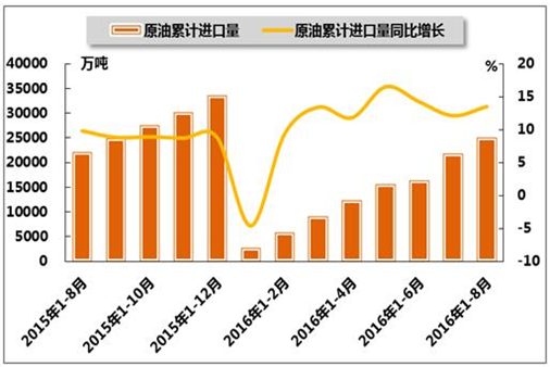 圖14 2015年8月-2016年8月同期我國(guó)原油累計(jì)進(jìn)口量及同比增長(zhǎng)率