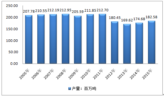 2005-2015年伊朗石油產(chǎn)量走勢圖(單位:百萬噸)