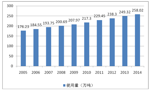 從 2005-2014 的全國農用薄膜產量及使用量的數據中可以發現,在國內市場強勁需求的推動下,我國農用薄膜產業整體保持平穩較快增長。隨著產業投入加大、技術突破與規模積累,在可以預見的未來,市場整體規模將持續擴大另外,盡管我國農用薄膜產量近年來迅速增長,其數值仍低于薄膜使用量(2014年產量為219.17,使用量為258.02),表明我國現階段仍需進口農用薄膜,亟需進一步擴大農用薄膜生產。
