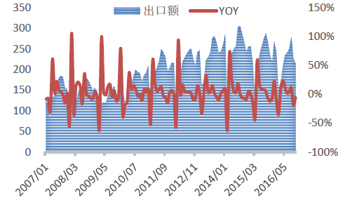 2007-2016年中國紡織服裝行業出口月度增長情況(億美元)
