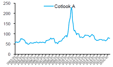 2003-2016年外棉Cot look A價格指數變動情況(美分/磅)
