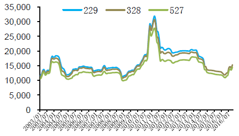 2016年棉價持續上升:1月份中棉328級棉花現貨價格指數為12923元/噸,3月份降至低點11679元/噸,而后受拋儲政策落地晚于預期拉動,4月棉價開始企穩回升,5月份上漲到12567元/噸。受國儲棉輪出量不及預期的影響,棉花價格在接下來的幾個月持續攀升:6月上漲至12694元/噸,7月繼續大漲至14316元/噸,8月上升至14674元/噸;9月受新棉集中上市影響棉價小幅回調至14258元每噸,10月因棉花產量同比下降5.7%,棉價再次走高至15315元/噸。短期而言,預計棉花現貨價格仍將維持小幅上揚的走勢,但明年棉價走勢仍需觀察拋儲細則及實際國儲棉出庫情況。