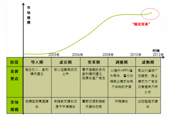 資料顯示,2008-2010年中國搜索引擎市場處于調(diào)整期,其中2010年是行業(yè)深入調(diào)整的關(guān)鍵時期。一方面,市場導(dǎo)向由拓展長尾廣告主數(shù)量轉(zhuǎn)變?yōu)樘嵘鼳PRU值:以2008年底發(fā)生的經(jīng)濟(jì)危機(jī)為契機(jī),基于預(yù)算限制及營銷效果雙方面的考慮,大品牌廣告主更多地嘗試搜索引擎營銷,并產(chǎn)生認(rèn)可;另一方面,搜索引擎運(yùn)營商在市場漸趨成熟之際,著眼于長期發(fā)展,著力協(xié)調(diào)商業(yè)模式與用戶體驗(yàn)間的矛盾,在商業(yè)模式上進(jìn)行一些變革和調(diào)整。