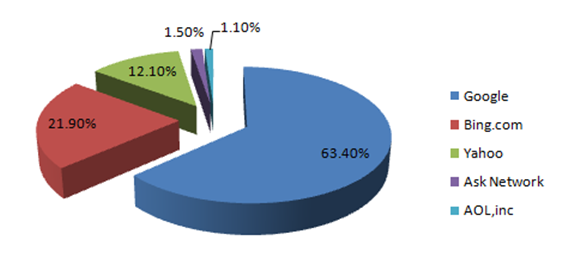 當前,Google 在美國桌面搜索引擎市場占據無可爭議的主導地位,占據63.4%的份額。雅虎美國搜索市場份額為12.1%。雅虎希望增加網絡和移動廣告營收,雅虎份額的提升與火狐達成默認瀏覽器協議有較大關系。除此之外,Ask和AOL搜索引擎市場份額都很小,Ask份額為1.5%,而AOL份額則在1.1%左右。
