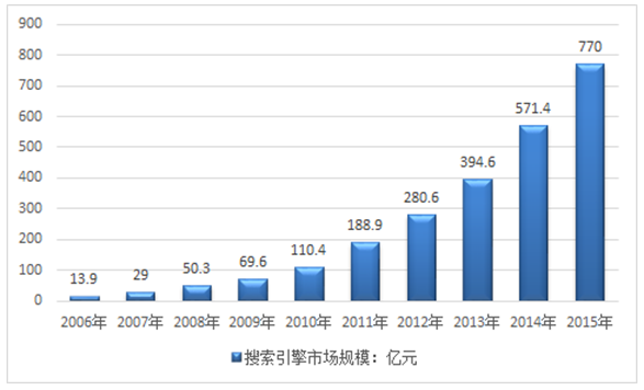 2006-2015年年我國搜索引擎市場規模走勢圖