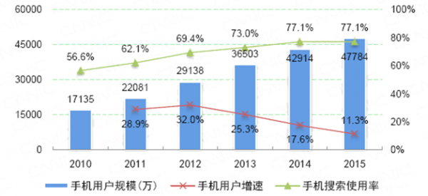 截至2015年12月,手機搜索用戶數達4.78億,使用率為77.1%,用戶規模較2014年底增長4870萬,增長率為11.3%。手機搜索是整體搜索引擎市場快速發展的持續推動力:2011年至今,手機搜索用戶規模年增長速度一直快于搜索引擎領域整體,在全國互聯網滲透率、搜索引擎使用率長期保持小幅增長的背景下,手機搜索使用率的增長幅度更大。
