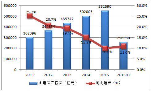 2016年上半年,全國固定資產投資(不含農戶)258360億元,同比名義增長9.0%(扣除價格因素實際增長11.0%),增速比一季度回落1.7個百分點。其中,國有控股投資91089億元,增長23.5%;民間投資158797億元,增長2.8%,占全部投資的比重為61.5%。分產業看,第一產業投資7460億元,同比增長21.1%;第二產業投資101702億元,增長4.4%;第三產業投資149198億元,增長11.7%,其中,基礎設施投資(不含電力、熱力、燃氣及水生產和供應業)49085億元,增長20.9%。從到位資金情況看,上半年到位資金282443億元,同比增長8.0%。其中,國家預算資金增長21.8%,國內貸款增長12.4%,自籌資金增長1.4%,利用外資下降7.2%。上半年,新開工項目計劃總投資240202億元,同比增長25.1%。從環比看,6月份固定資產投資(不含農戶)增長0.45%。