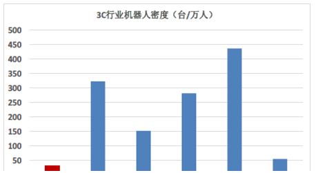 3C 自動化程度較低,機器人密度遠低于國外。目前國內3C 行業機器人密度僅為50 臺/萬人,而日韓的機器人密度早已超過了1200 臺/萬人,自動化率差距較大。根據2013 年工信部發布的推進工業機器人產業指導意見,到2020 年國內要形成較為完善的工業機器人產業體系,機器人密度達到300 臺/萬人以上,將在2011 年的基礎上提高近6 倍,而3C 制造業目前對人工的需求較大,未來自動化率的提升速度將遠高于其他制造業。