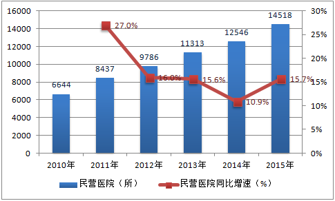 2010-2015年中國(guó)民營(yíng)醫(yī)院數(shù)量及增速