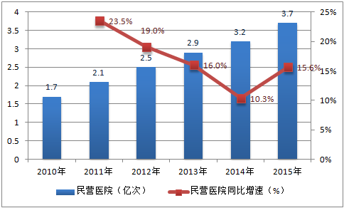 2010-2015年中國(guó)民營(yíng)醫(yī)院診療人次及增速