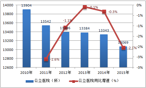 2010-2015年中國(guó)公立醫(yī)院數(shù)量及增速