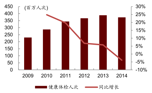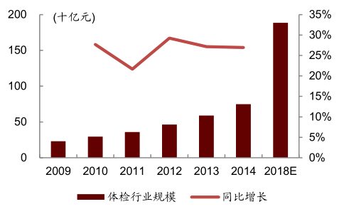 核心提示:中國健康體檢行業正處發展初期,2014 年行業規模約為 750 億元,近年增長均在 25%以上,至 2018 年預計將達到 1880 億元。診療人次增長穩定,預計近年可檢項目在逐步增加。中國體檢行業規模與增速資料來源:公開資料整理中國體檢行中國健康體檢行業正處發展初期,2014 年行業規模約為 750 億元,近年增長均在 25%以上,至 2018 年預計將達到 1880 億元。診療人次增長穩定,預計近年可檢項目在逐步增加。