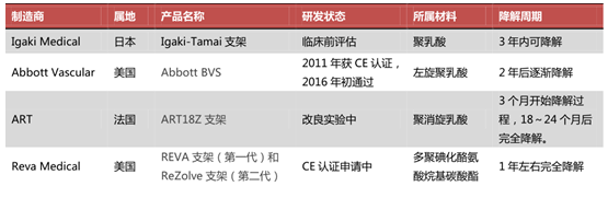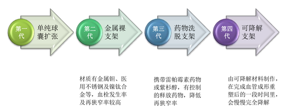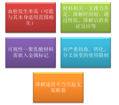 1)可降解多聚物支架:是指藥物洗脫的高分子聚合物支架,如聚乳酸類,支架無毒且降解物為 CO2 和 H2O,降解期為 2 年左右;