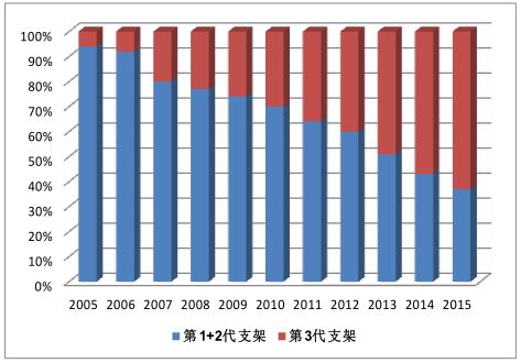 高頻研究推動心血管介入技術不斷成熟。心血管介入器械主要包括支架、球囊擴張導管以及配套的導絲、導管、栓塞等部件。以支架為代表的心血管介入器械發展至今已經進入第四代的研發階段,且國內的冠脈支架獲得了技術上的不斷突破,現在上市產品中,支架產品已經基本完成了進口替代,國產占比達到 80%以上,也從側面反應出國內支架產品的技術日趨完善和成熟。全球心血管介入治療市場規模呈現逐年增長趨勢,在 2014 年已突破 200 億美元,國內 PCI(冠狀動脈介入)手術數量也呈遞增趨勢,支架的使用新舊迭代趨勢明顯,國內支架產品整體進口替代趨勢加快,且近年來的產品競爭使得價格趨勢不斷走低,支架產品需在技術上尋求新的突破。