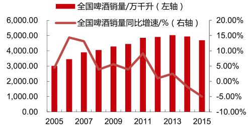 核心提示:我國啤酒行業(yè)近幾年一直處于下行期,增速不斷下滑,自 2014 年開始全國啤酒銷量首次出現(xiàn)負(fù)增長,2015 年負(fù)增長趨勢繼續(xù)擴大,增速下滑至-4.97%,同時,我國進口啤酒數(shù)量從 2008 年開始就呈現(xiàn)直線上升趨勢,2016 年 9月,我國進我國啤酒行業(yè)近幾年一直處于下行期,增速不斷下滑,自 2014 年開始全國啤酒銷量首次出現(xiàn)負(fù)增長,2015 年負(fù)增長趨勢繼續(xù)擴大,增速下滑至-4.97%,同時,我國進口啤酒數(shù)量從 2008 年開始就呈現(xiàn)直線上升趨勢,2016 年 9月,我國進口啤酒數(shù)量達到 51.2 9 萬千升,較 2008 年 9 月同比上漲幅度高達 2188%,在國內(nèi)行業(yè)景氣不佳,外來進口啤酒沖擊的雙重夾擊下,我國國內(nèi)啤酒企業(yè)的整體業(yè)績表現(xiàn)不佳,主要啤酒企業(yè)營收從 2013 年開始均呈現(xiàn)下滑趨勢,到 2015 年,四家上市公司銷量均出現(xiàn)了負(fù)增長,其中燕京啤酒負(fù)增長幅度最大,2015年燕京啤酒銷量下降了9.23%,青島啤酒緊隨其后,2015 年銷量下滑 7.36%。