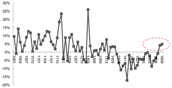 2010 年1月至 2016 年9 月全國啤酒產(chǎn)量當(dāng)月同比