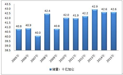 2005-2015年亞太石油儲量走勢圖(單位:十億加侖)