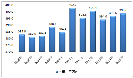 2005-2015年亞太石油產量走勢圖(單位:百萬噸)