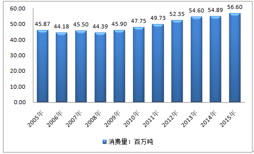 2005年泰國石油消費量45.87百萬噸,2010年泰國石油消費量47.74百萬噸,2015年泰國石油消費量56.60百萬噸。