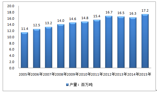 2005-2015年泰國石油產量走勢圖(單位:百萬噸)