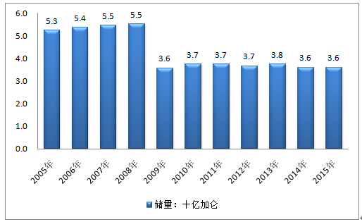 2005-2015年馬來西亞石油儲量走勢圖(單位:十億加侖)
