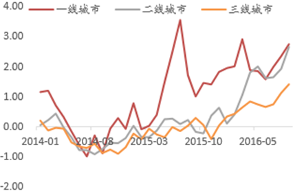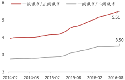 多重政策疊加的效果不斷釋放,一線城市房地產市場率先復蘇,而二三線城市市 場表現差強人意,造成了嚴重的分化格局。從價格來看,2015年3月起,一線城 市連續保持了近20個月環比連續正增長,累計漲幅高達40.74%,二三線城市價格 環比漲幅轉正,但是仍遠遠低于一線城市漲幅,一線城市和二三線城市價格差距 不斷加大。相對價格來看,二三線城市相對價格基本保持同幅變化,一線城市與 二三線城市價格比不斷攀升,2016年9月,一線城市與二線城市價格比達到3.5, 與三線城市價格比值達到5.51。