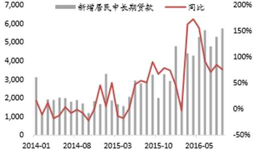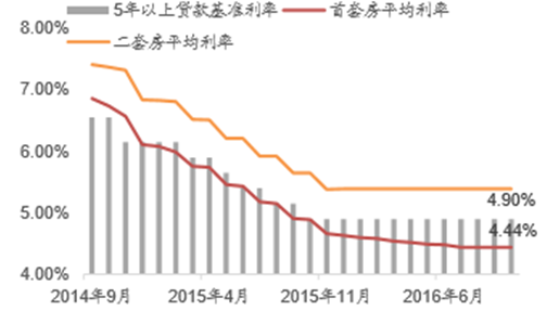 從資產荒的角度來看,個人住房貸款擴張是銀行的必然選擇。隨著經濟下行,不 良資產壓力變大,個人住房貸款成為銀行青睞的優質資產,因此銀行加大個人住 房貸款的發放力度,甚至在不同程度上給予利率折扣。根據融360公布的數據, 全國首套房貸款利率持續下行,目前僅為4.44%,低于基準利率46個BP,二套房 貸款利率受政策限制保持在基準利率上浮10%的水平。此外,2015年6月起央行 取消了商業銀行貸存比約束,信貸投放能力增強。大量信貸被投放到了住房貸款 中。從2014年11月央行降息起,新增居民中長期貸款快速增長。2016年9月居民 中長期貸款新增5741億元,占當月新增貸款比重達到47.1%。