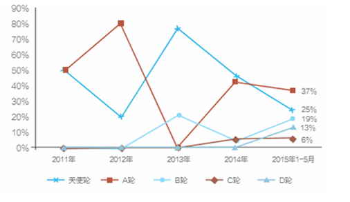2011- 2015年5月中國K12在線教育市場融資輪次分布(單位:%)