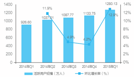 2014Q1-2015Q1中國K12在線教育市場活躍用戶規模 (單位:萬人,%)