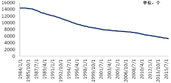 3)縱觀國外的發展經驗,我們可以看到,美國銀行數量在穩步向下,市場 經過不斷重整和合并,現在美國商業銀行的數量趨于穩定,同時我們可以看 出,美國已經逐漸向混業經營模式轉變,越來越多出現大的金融財團。商業 銀行的黃金時點已經接近尾聲,未來銀行業會逐步進入優勝劣汰的格局。隨 著監管政策的趨緊,現在中國的銀行業已經出現過度競爭的勢頭,未來大的 銀行機構面臨改革的考驗而中小銀行則更多面臨生存的考驗。