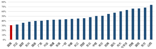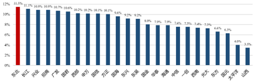 2016 年前三季度,國海業績降幅為 30.6%,在上市券商中降幅最低,業績相對穩健,山西證券業 績降幅高達 73.9%,降幅最高。 凈資產收益率方面,前三季度上市券商實 現年化 ROE 8.88%,較上半年略微提升,彰顯券商盈利能力強勁、業績 旱澇保收(牛市 ROE 超過 20%,熊市亦能達到 5%以上)。上市券商中, 東北前三季度 ROE 高達 11.5%,位居行業第一。